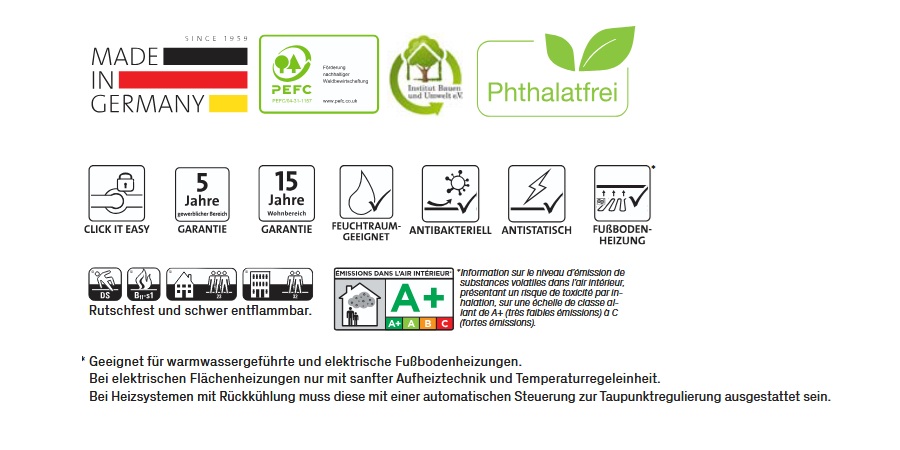 - Empfohlene Nutzungsklasse 23/31: geeignet für Wohnräume mit starker Nutzung und Gewerberäume mit geringer Nutzung.